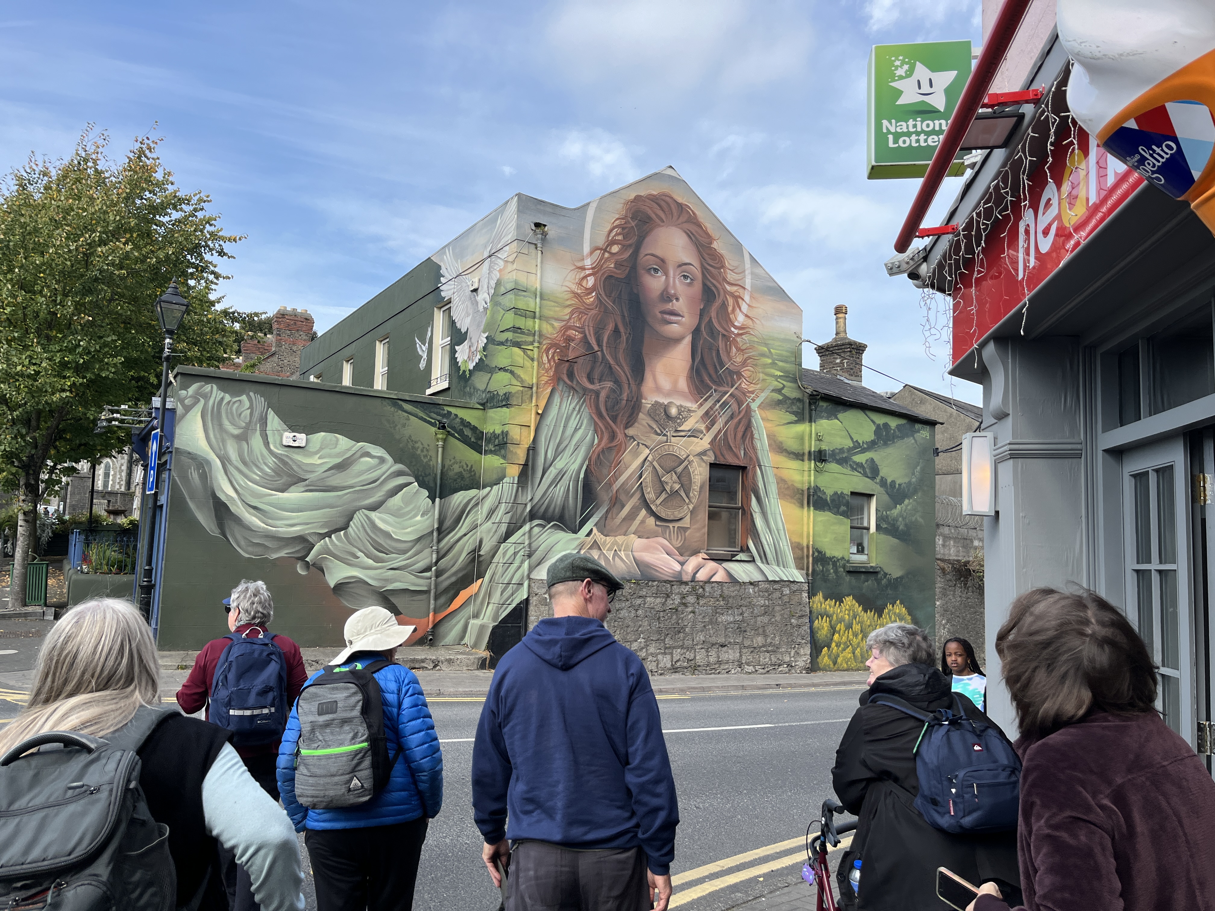 Strolling through the center of Kildare, you can’t help stepping into Brigid’s footsteps: this figure revered as Celtic mother goddess and Christian saint smiles at you larger than life from murals on McHugh’s Pharmacy and the Firecastle Pub. Since 2012 I have been part of a circle in Santa Cruz acting to keep Brigid’s legacy alive, so it was with the spirit of a pilgrim that I spent an afternoon around the corner from the pub at the site of the fire temple where a flame was kept burning in ancient times to honor the goddess and later the saint who bore her name. For centuries before and after Christianity came to Ireland, women tended that flame to the sacred feminine until it was extinguished during the Reformation.