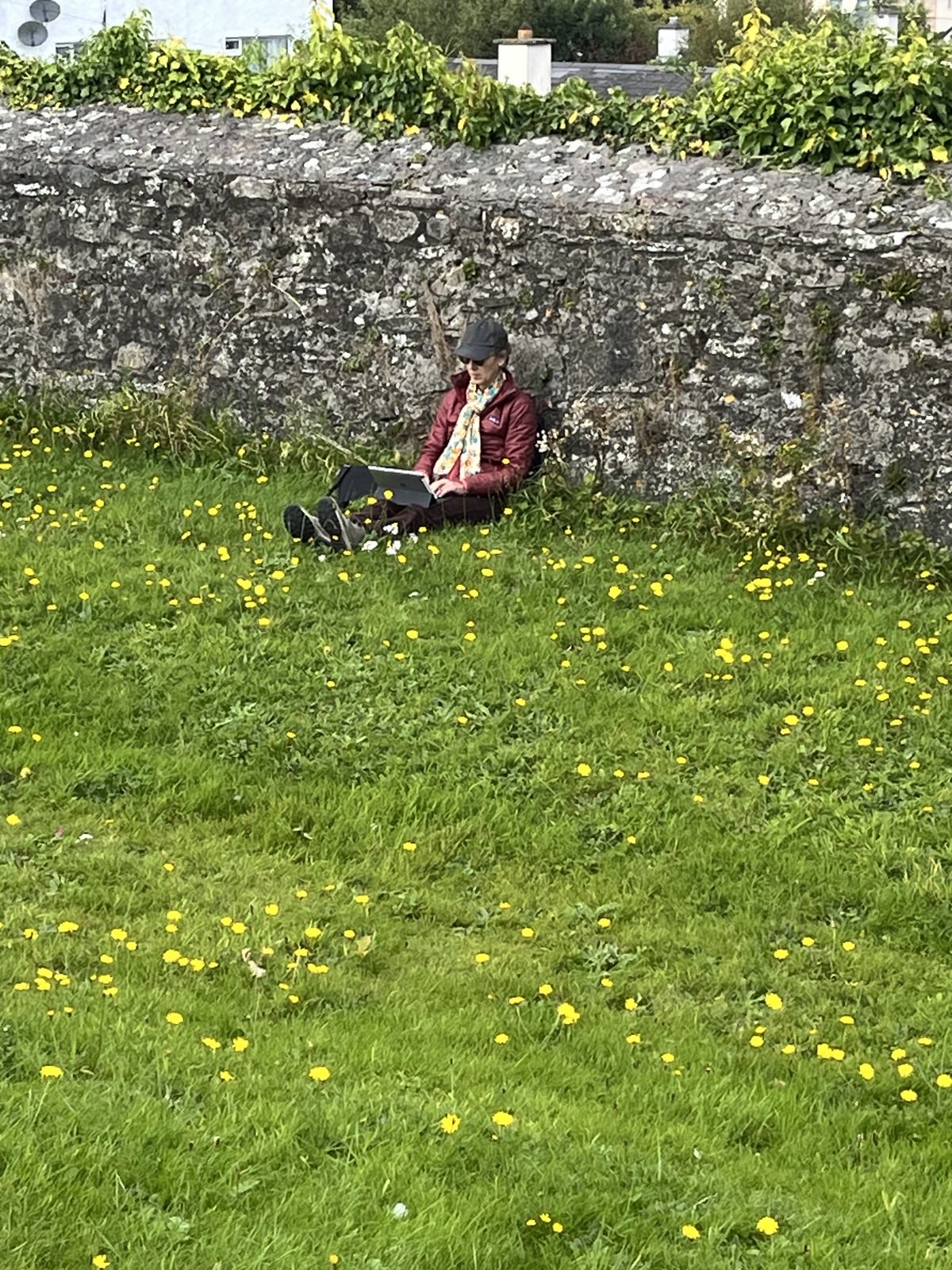Leaning against a stone wall that marks the old boundary of St. Brigid’s monastery, I pulled out my iPad for some writing en plein air in a field of green grass dotted with white alyssum, yellow cat’s ear, and old gravestones. Gray clouds drifted across the sky, and birdsong mixed with the distant hum of traffic from town, clattering from the restoration of the medieval round tower on my right, and soft-voiced visitors drifting into the cathedral. Before me was the fire temple, surrounded by a short rectangular wall with stairs leading down to a depression in the earth, empty now as a breeze danced through the sea of yellow flowers. Once upon a time this enclosure might have been round instead of rectangular, formed by hedgerows instead of stone. Long ago it did not share this field with a Christian church and cemetery; now it does, a tangible reminder of how devotion to the goddess transformed into a fidelity acceptable to those in power, transformed, but in the red-hot heart of the fire, one and the same.