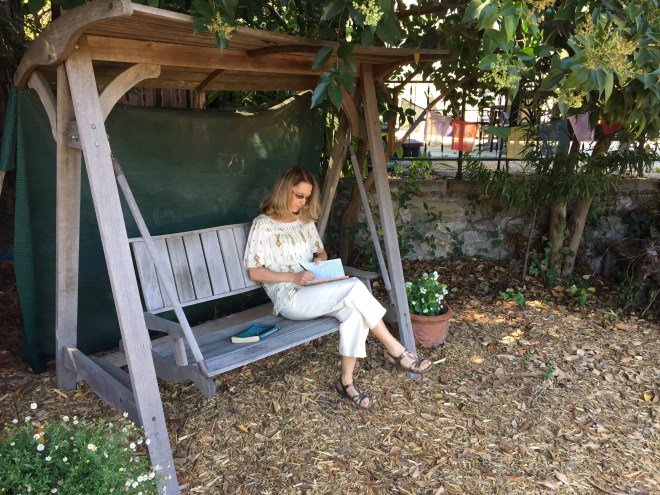 Our yet-to-be-born children would rock on this garden swing with their sweethearts one day, my ex-husband and I imagined when we bought it over twenty years ago. The jarrah wood was smooth then, polished a deep and lustrous brown. We bought a can of special oil too on the salesman’s recommendation, fully intending to recoat the swing at least once a year to protect the Australian hardwood, but that oil, like my husband and the dream of children we might have had, is long gone.